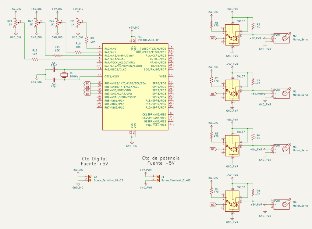 Se programó el microcontrolador para generar cuatro señales PWM de salida, con un período de 20 ms y un ancho de pulso de 500 µs a 2500 µs, para controlar la posición de los servomotores. La posición de los servomotores se modifica utilizando la lectura de las señales de los potenciómetros conectados a los pines analógicos del microcontrolador.