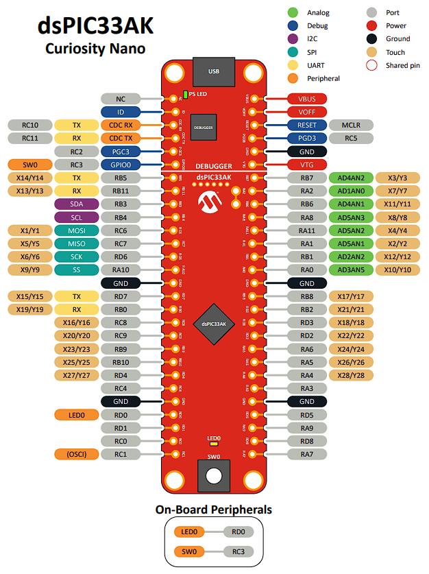 El kit de evaluación Curiosity Nano dsPIC33AK512MPS506 es una placa de evaluación basada en el controlador de señal digital dsPIC33AK512MPS506. Se trata de un DSC de 32 bits que opera a 200 MHz, con 512 KB de memoria Flash, 64 KB de SRAM y un coprocesador de unidad de punto flotante (DP-FPU) de precisión simple y doble. Incorpora ADCs de 12 bits con una tasa de conversión de hasta 40 MSPS y generadores de ocho pares (dieciséis salidas) con resolución de colocación de bordes finos (FEP) de hasta 78 ps. AdemÔs, integra un depurador con interfaz de puerta de enlace de datos y un puerto COM virtual (CDC), asà como un conector USB-C que alimenta tanto al depurador como a un regulador de objetivo ajustable de 1.8 V a 5.5 V, controlado por el propio depurador.