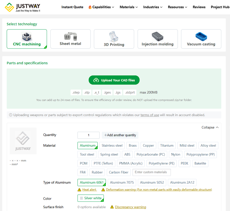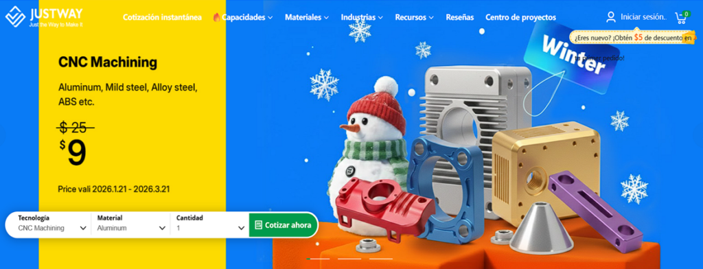 Actualmente, JUSTWAY ofrece una promoción especial en servicios de mecanizado CNC, con precios desde $9 dólares para la fabricación de piezas en materiales metálicos como aluminio, acero inoxidable y acero dulce, así como en plásticos como ABS. Esta oferta representa una excelente oportunidad para convertir prototipos de diseños en piezas reales y estará disponible del 21 de enero al 21 de marzo de 2026.