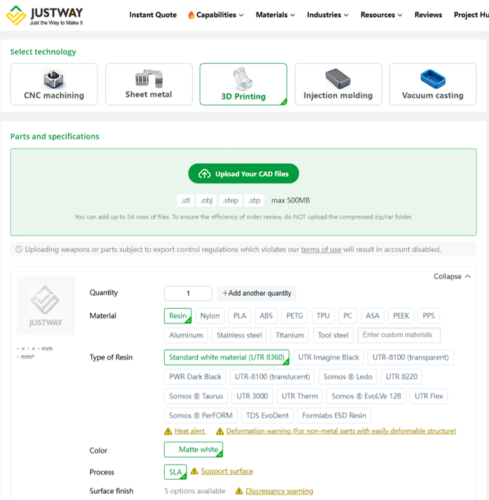 Una de las empresas que facilita este tipo de servicios es JUSTWAY, un proveedor de fabricación industrial que ofrece servicios de impresión 3D en múltiples tecnologías a través de su plataforma en línea. Justway admite una amplia variedad de procesos de fabricación aditiva, incluyendo SLM, SLS, MJF, DLP, SLA y FDM, lo que permite fabricar desde prototipos hasta componentes técnicos funcionales con características específicas para industrias como la electrónica, automotriz, médica, aeroespacial y robótica.