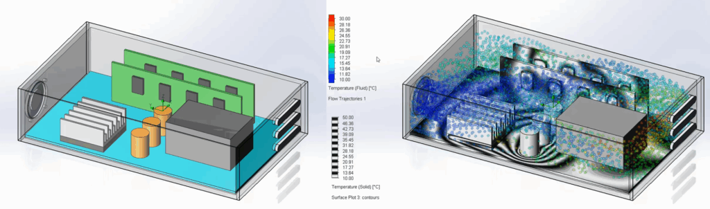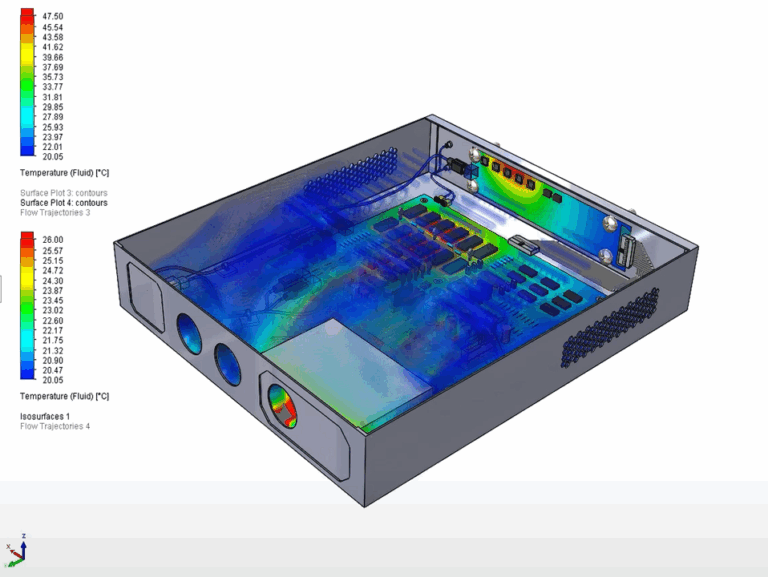 Es posible diseñar dispositivos electrónicos con carcasa de chapa metálica y simular su comportamiento térmico mediante herramientas como SolidWorks Flow Simulation. Este software permite modelar cómo se distribuye el calor dentro del equipo, considerando conducción a través de la chapa, convección del aire (natural o forzada) y radiación hacia el ambiente. Esto permite anticipar el comportamiento real del sistema, identificar puntos calientes y evaluar la eficiencia de la chapa metálica como disipador antes de fabricar un prototipo físico.