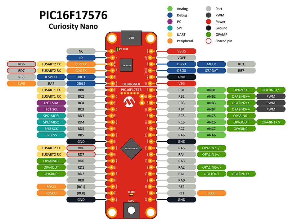 Mapa de pines PIC16F17576 Curiosity Nano