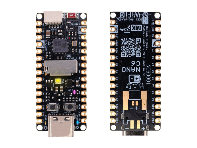 La placa incorpora un procesador ESP32-C6FH4 RISC-V de 32 bits a 160 MHz, 512 KB de SRAM y conectividad Wi-Fi 6, Bluetooth 5 LE e IEEE 802.15.4 (Zigbee 3.0 y Thread). Además, incluye una ranura microSD para tarjetas de hasta 64 GB conectada a los pines de comunicación SPI, un conector QWIIC (JST-SH) compatible con módulos de expansión mediante el protocolo I2C, un LED RGB WS2812B direccionable y soporte para batería LiPo de 3.7 V–4.2 V (conectores PH2.0 mm/JST 1.25 mm no ensamblados), lo que la convierte en una solución versátil para proyectos portátiles y de bajo consumo.