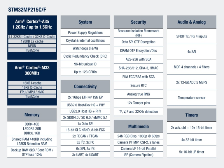 - Microprocesador STM32MP215FAN3 basado en Arm ® Cortex ® ‑A35 hasta 1,5 GHz y Cortex ® ‑M33 a 300 MHz en un encapsulado VFBGA273
